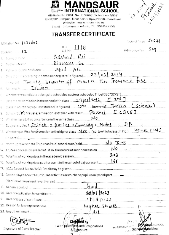 Class 12th Transfer Certificate |
