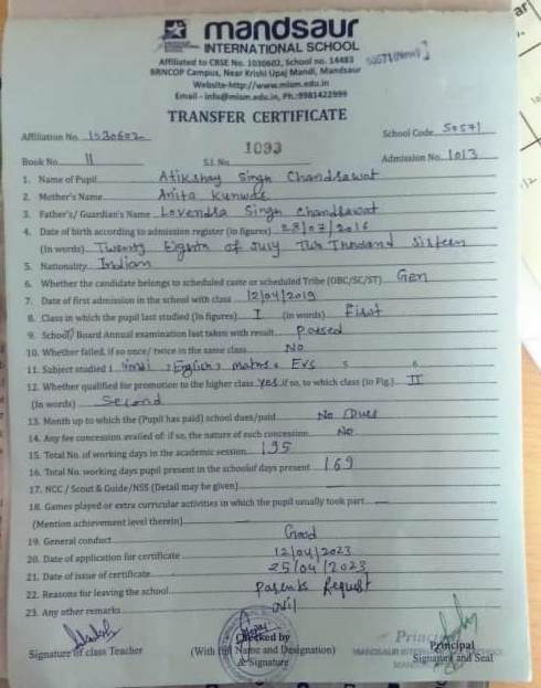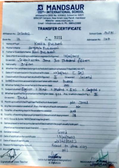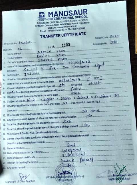 Class 9th Transfer Certificate |
